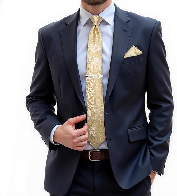 Silk Floral Ties for Men Woven Paisley Necktie and Tie Clip Handkerchief Cufflinks Set for Party Wedding( Light Yellow Paisley)